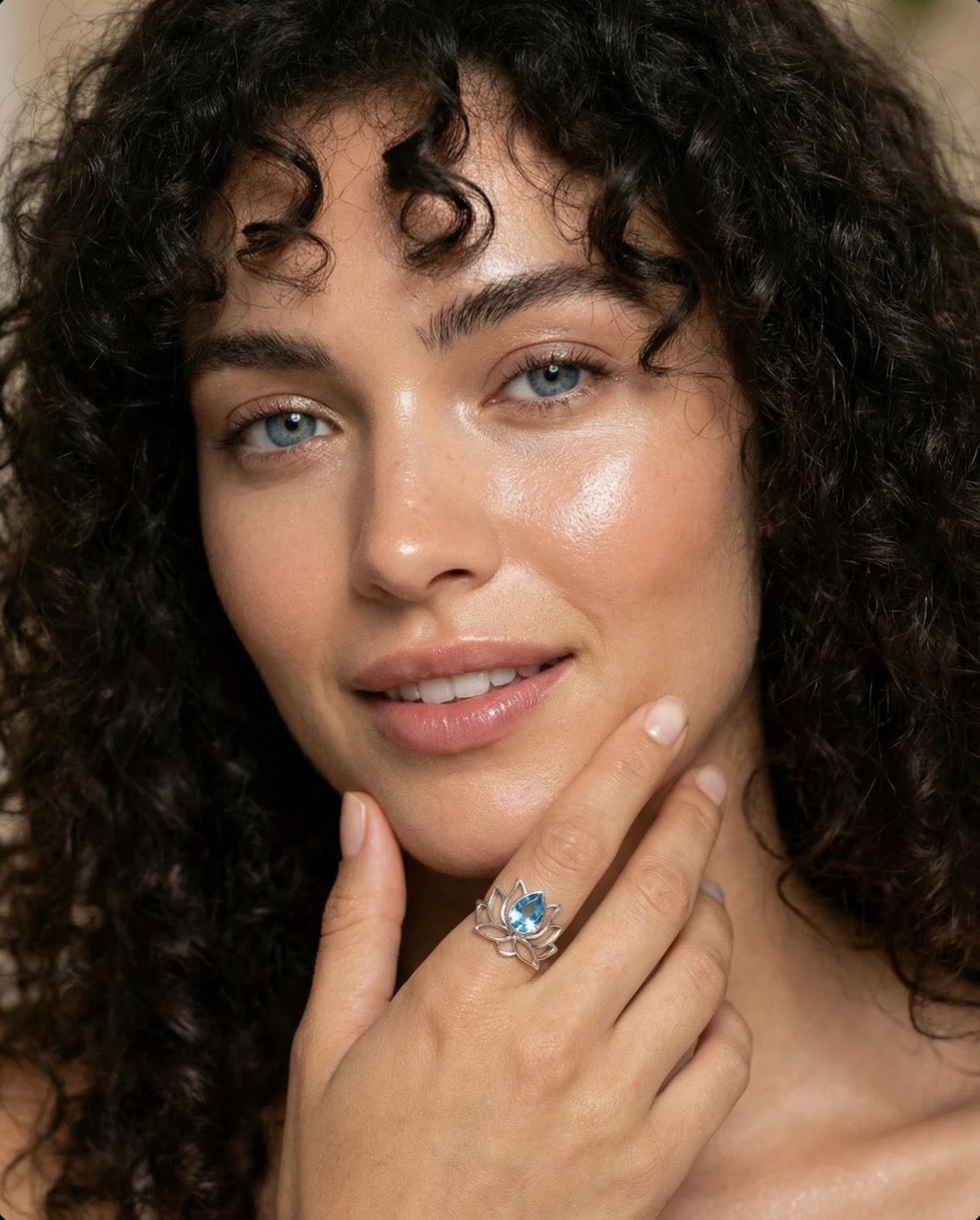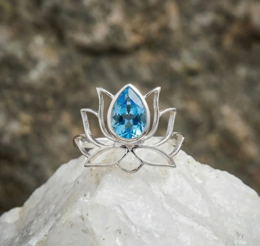 Beautiful and ethereal solid sterling silver lotus ring in Blue Topaz✨